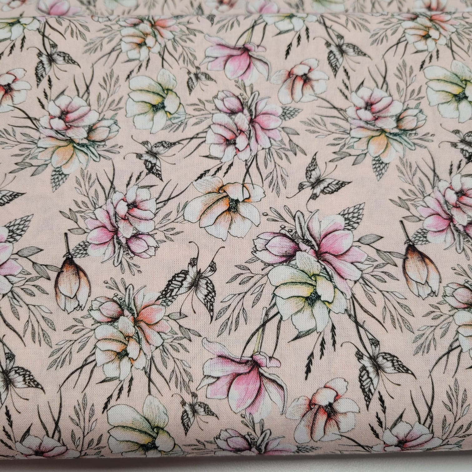 Baumwoll - Popeline Blüten und Schmetterlinge auf apricot