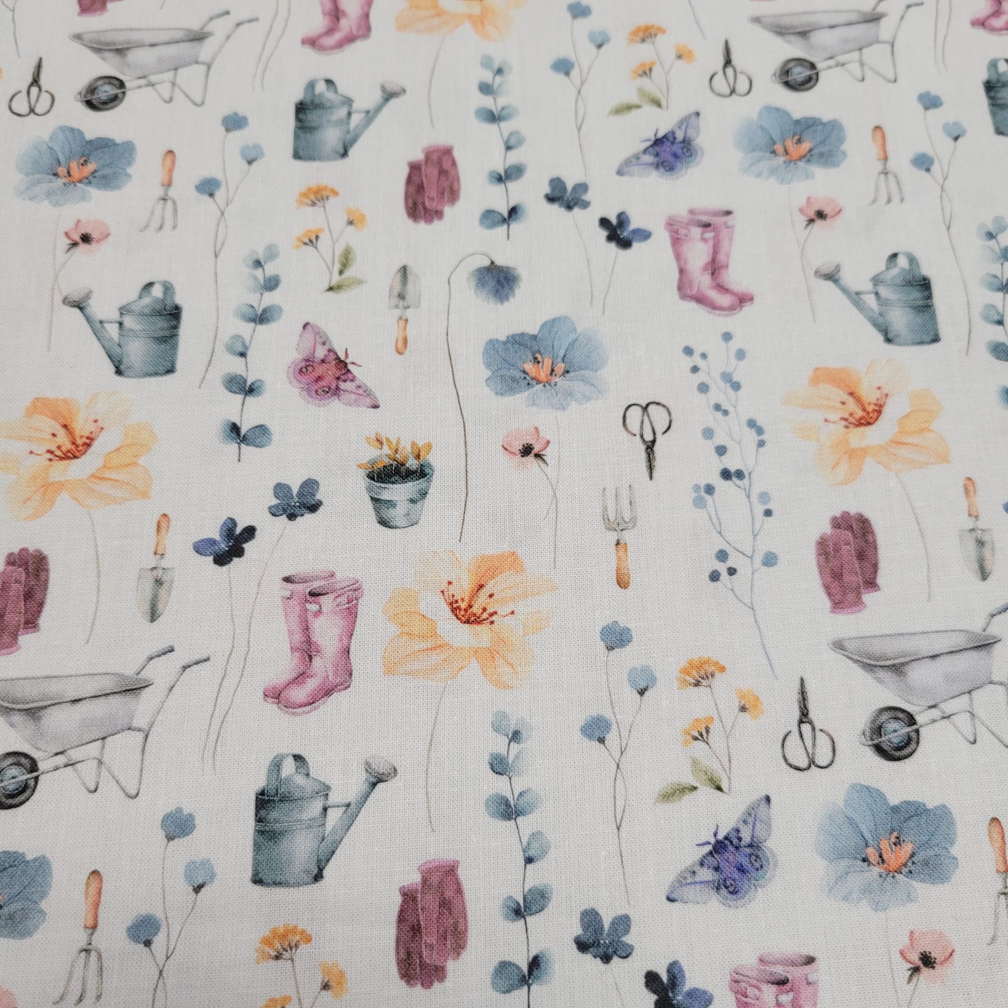 Baumwoll - Popeline Garten - Gießkanne, Gummistiefel, Blumen + Schubkarre