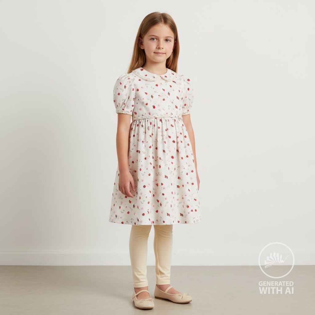 Preview: Baumwoll Popeline mit kleinen Marienkäfern + Glückskäfern und kleinen Blättern auf weiß