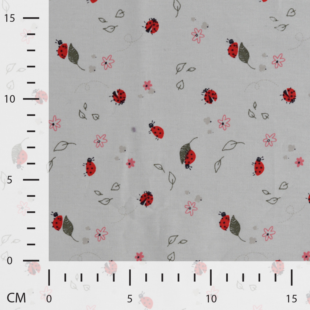 Mobile Preview: Baumwoll Popeline mit kleinen Marienkäfern + Glückskäfern und kleinen Blättern auf weiß