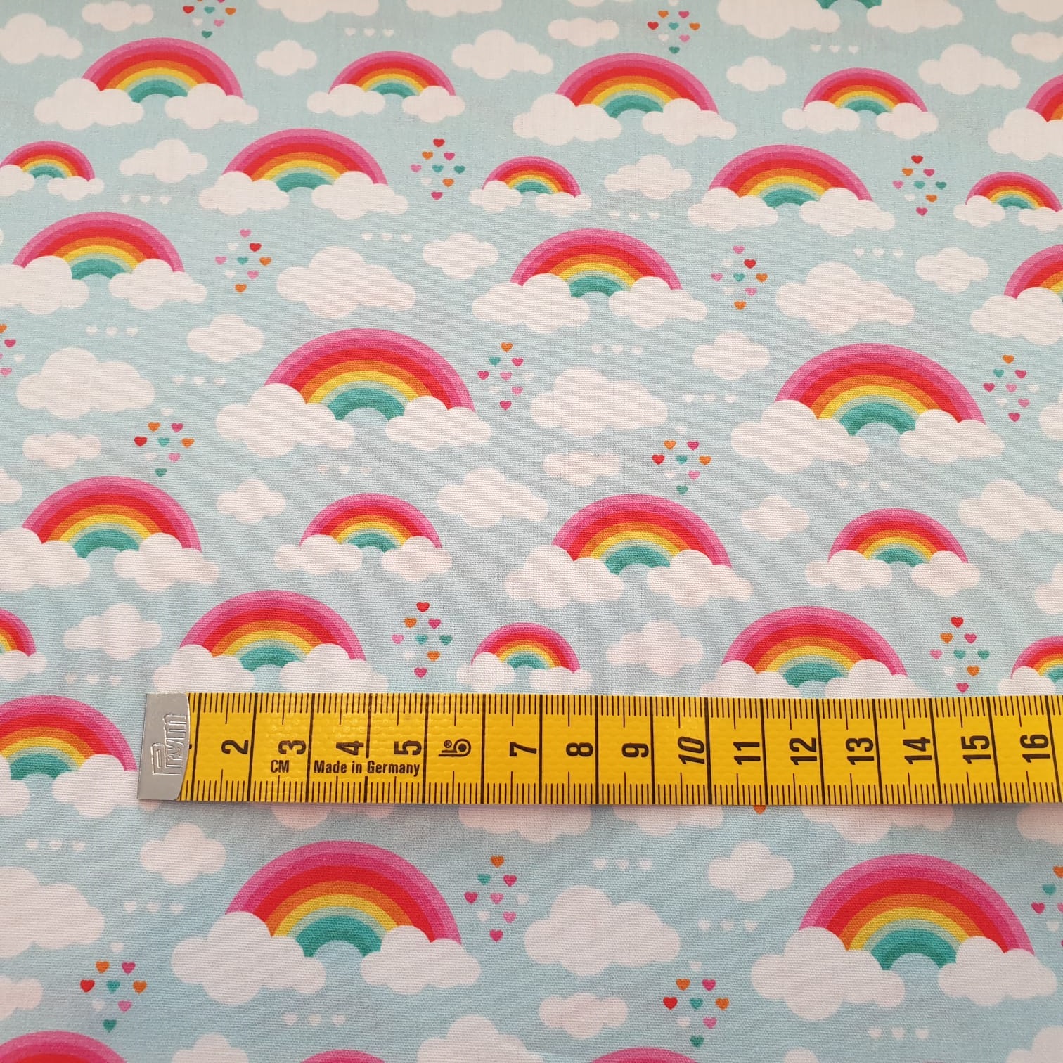 Baumwoll Webware Kim - Regenbogen und Wolken auf hellblau - Rest 0,5 m