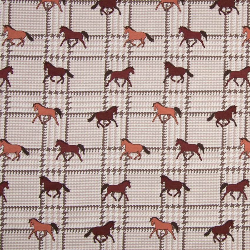 Baumwolljersey Pferde + Karo sand/ braun