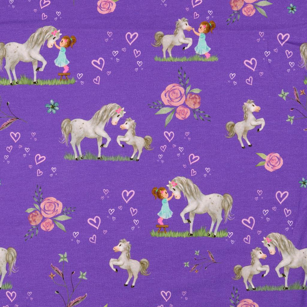 Baumwolljersey Pferde + Mädchen auf lila - Digitaldruck