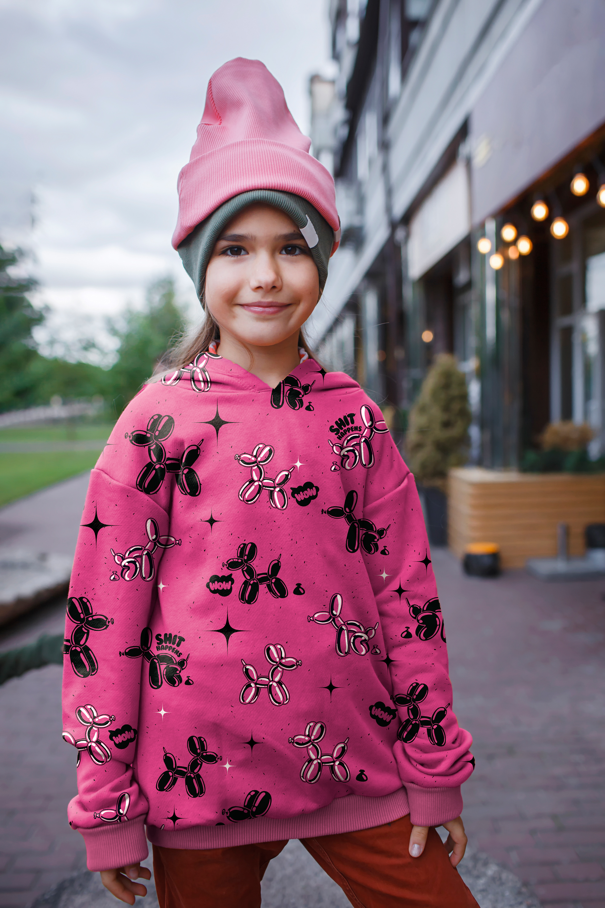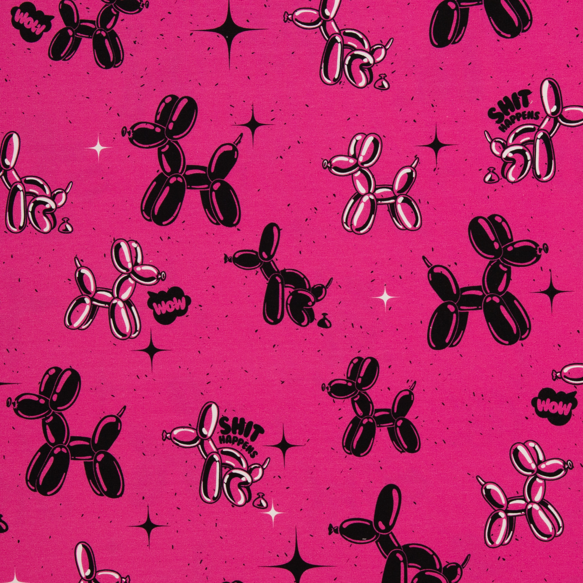 French Terry Shit happens by Thorsten Berger - viele kleine Luftballon - Hunde auf pink