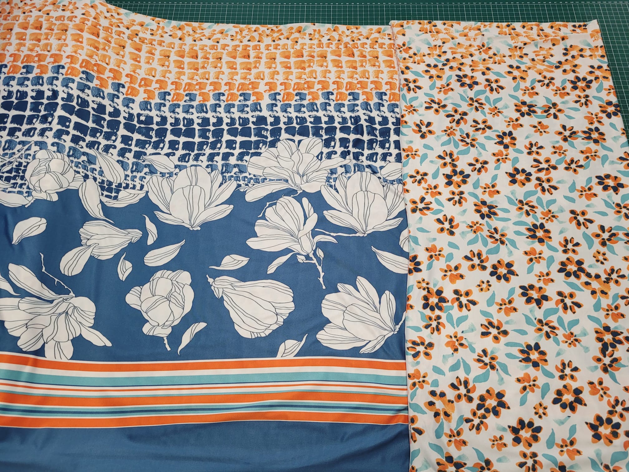 Jersey mit Bordürendruck mit Blüten in blau - oranga