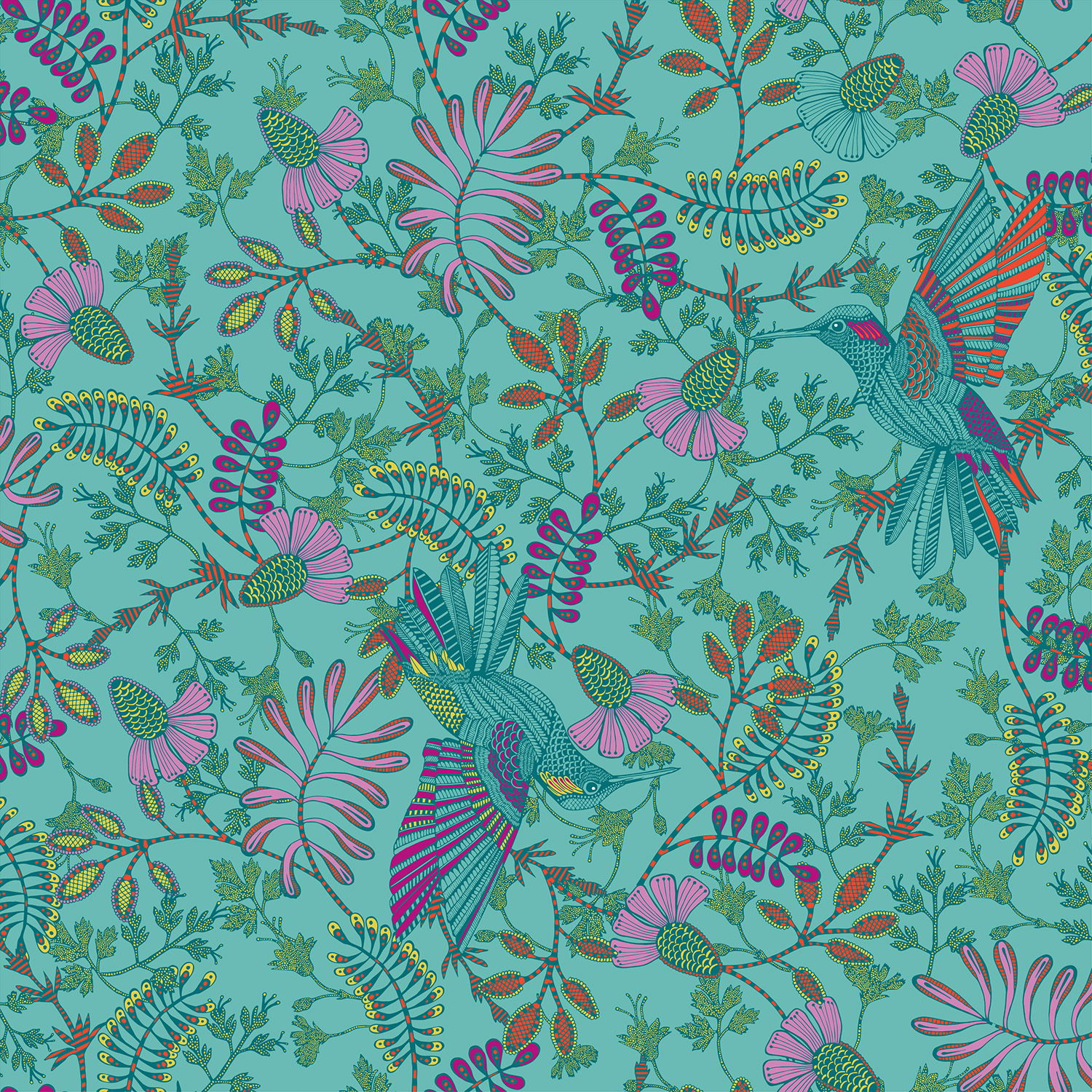 Viskose Voile Tiffany - Blüten und Kolibris auf mint